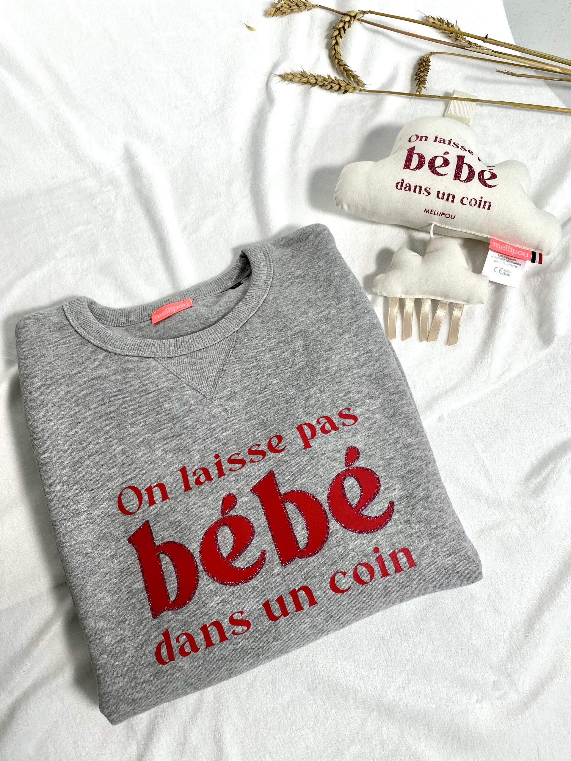 Avec le sweat-shirt femme culte – « On ne laisse pas bébé dans un coin » – Gris chiné, plongez dans un cocon de douceur. Confectionné avec le plus grand soin, il invite à la détente tout en affichant un style affirmé et décontracté grâce à son col rond évasé et ses finitions soignées.