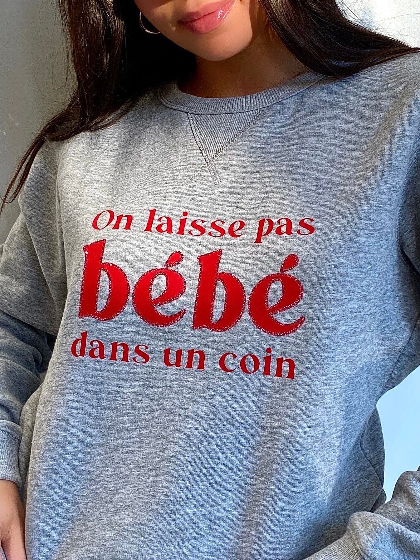 Profitez du confort ultime avec notre sweat-shirt femme culte – « On ne laisse pas bébé dans un coin » – Gris chiné